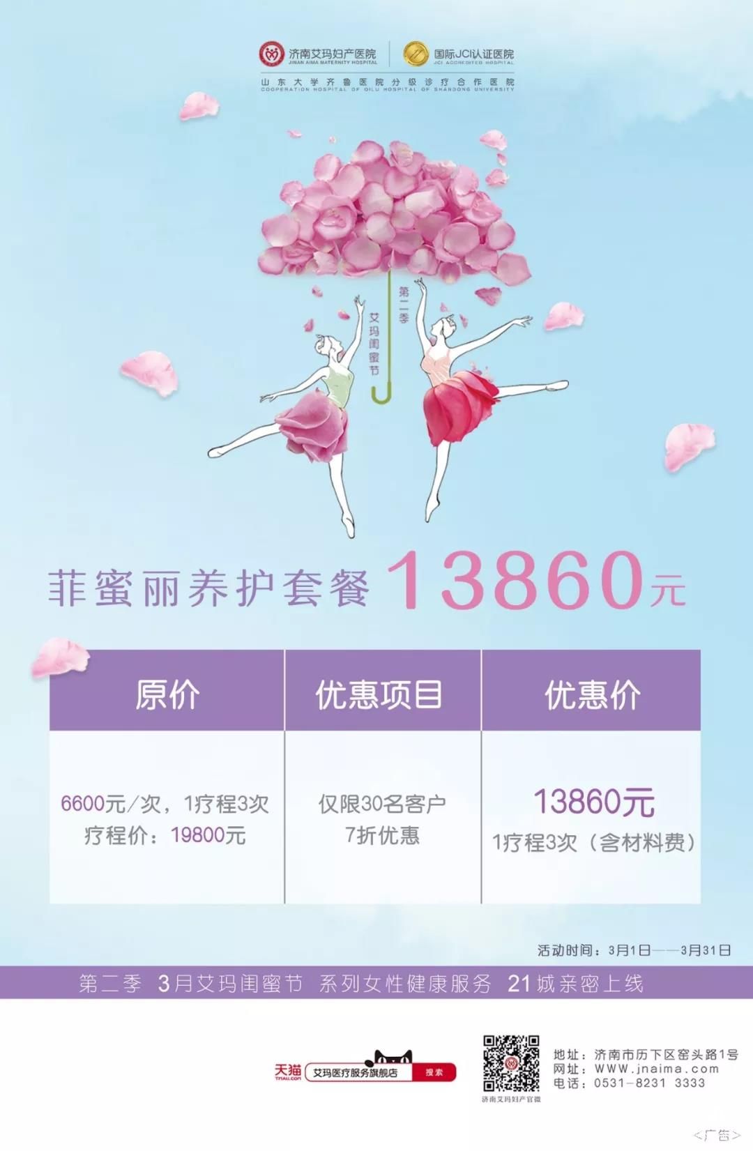 3月,在這個愛與優雅的月份里,我們曾約定要一直擁有美麗和自信。為了給女性朋友更優質的生活,艾瑪婦產為泉城女性準備了第三重好禮:菲蜜麗私密養護——原價19800元的菲蜜麗養護套餐限價13860元,讓小仙女們的世界更加多姿多彩!