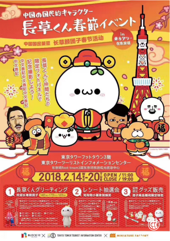 文創產品、IP授權也成為2018年我國在海外開展“歡樂春節”活動的新焦點。今年春節期間,國民形象IP“長草顏團子”與十二棟文化旗下其他原創動漫形象制冷少女、旱獺、熊卷等一起受邀登上日本東京塔與輕井澤購物廣場進行展示,與游客進行親密互動,將濃濃的中國年味兒帶到海外。