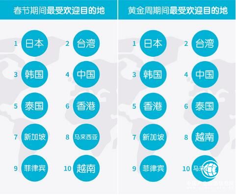 據天巡出境數據顯示,在特定節假日前期間,中國出境游人數增長十分可觀。最值得關注的是,中國春節期間的增長量為16%,黃金周期間則達到了39%。我們也找出了這些節假日期間最熱門的旅游目的地,以及受節假日影響增長幅度最大的目的地并匯總如下: