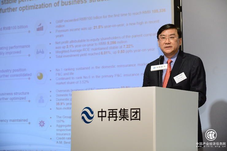 2017年,中再集團堅持以“一三五”戰略為指引,加快創新、協同、裂變,在國家戰略和服務實體經濟中挖掘新機遇、優化管控機制、有效防控風險,業務結構持續優化、發展速度和質量不斷向好:一是保費規模突破千億,達1053.36億元人民幣,整體實現21.5%的保費增速,創近年來新高。二是經營效益穩步提升,歸屬于母公司股東的凈利潤達52.56億元人民幣;加權平均凈資產收益率7.22%,保持穩定;總投資收益率為6.01%,同比提升0.53個百分點。三是行業地位持續穩固,財產再保險、人身再保險業務境內市場份額穩居行業第一位;財產險直保業務穩居行業前六位,市場份額為3.52%。四是業務結構持續優化,財產再保險境外業務同比增長22.9%;財產再保險境內臨分業務同比增長50.8%;人身再保險境內保障型業務同比增長35.9%;財產險直保非車險業務同比增長44.7%。五是償付能力保持充足,集團合并綜合償付能力充足率197%;中再產險、中再壽險、中國大地保險綜合償付能力充足率分別為218%、234%和267%;2017年獲得貝氏評級“A(優秀)”,標準普爾評級“A”。