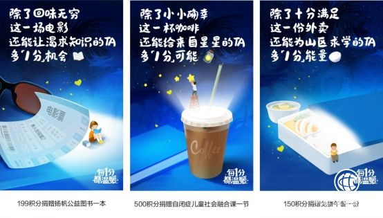 什么概念呢?就是說,這些積分可以換成3萬多本圖書,幫助300多所小學建成迷你圖書館;這些積分也可以換成1.5萬節社會融合課,有可能幫助成千上萬名自閉癥兒童融入社會、生活自理;這些積分也可以換成5萬頓營養餐,夠150名貧困山區的孩子,足足吃一年。