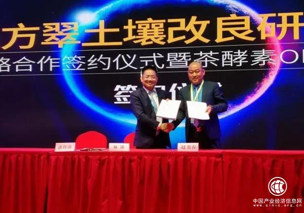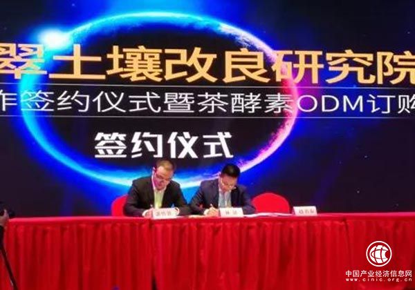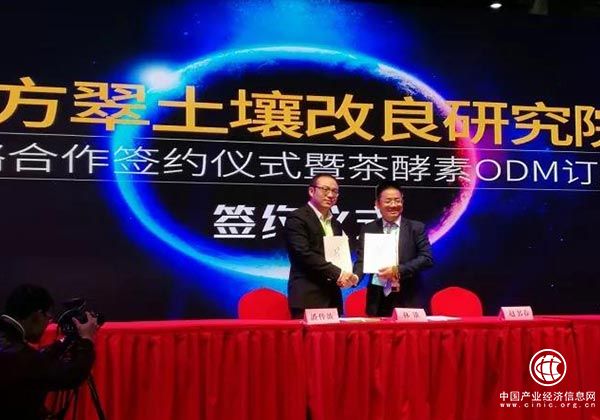 東方翠董事長林錐與谷菲生物董事長趙書春,簽署了年銷售額8000萬元戰略合作協議及茶酵素ODM訂購供貨合同