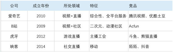 首先,網絡視頻行業概念很廣,從終端來說早期的網頁、到PC+移動APP,到現在許多純移動APP;從屬性來說有視頻、直播、視頻+直播;從內容分布來說有大型綜合性平臺,也有垂直的影音劇集、社交、游戲、體育、教育等類別。 我們首先理一理這四家(如下圖)從成立時間來看,愛奇藝和B站屬于一個時期,虎牙是最早是YY旗下的游戲直播業務,映客成立于2014年末期,算是當時的現象級產品,至今不到4年。