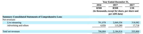 同樣映客直播收入占比超過99%,對于收入分成只有平臺和主播,映客本身沒有工會的形式。但是跟用戶數據一樣,映客的收入2017年對比2016年是下滑的,同比減少了9%。