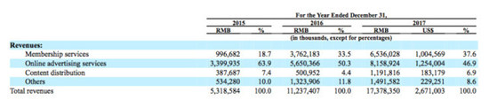 愛奇藝的招股書顯示,收入主要貢獻為廣告、會員服務和內容分發。截止2017第四季度,在線廣告業務為最大收入貢獻,占比46.9%,第二的是會員收入占比27.6%,而在剛剛公布2018年第一季度業績中,會員和廣告收入首次基本持平,分別為42.8%和42.9%,二者合計占營收總額的85.7%。