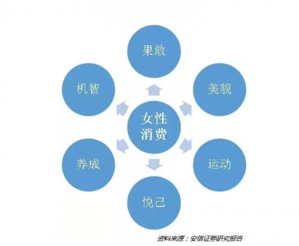 “她經濟”的強勢崛起,令許多商家和平臺不得不改變或者重新調整戰略以迎合市場需求,洞悉并掌握“她經濟”大潮下的女性消費偏好與趨勢,便成為了商家的首要要務。安信證券的一份研究報告中總結了“她經濟”生態圈中女性消費的幾大關鍵詞(見圖),果敢、美貌、運動、悅己等詞語組合而成的消費偏好圈,也揭示了新時代女性對產品價值與生活品質的重視程度。