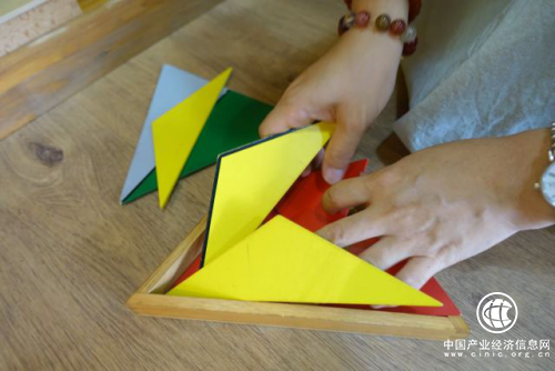用帶有顏色的三角板拼湊成不同形狀的三角形,去感知整體和均分以及形狀的變幻。