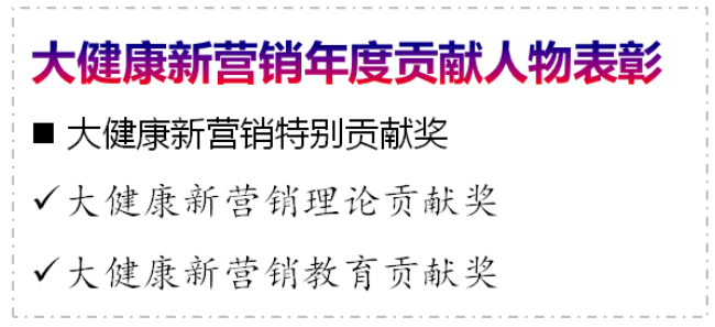 大健康新營銷特別貢獻獎作為峰會特設獎項,大健康新營銷年度貢獻人物表彰環節,將從行業各細分領域推舉并評選出,為行業的改革發展和社會進步作出突出貢獻的杰出人物。他們中既有銳意進取的先行者,也有推動學術營銷的帶頭人;既有模式創新的攻堅跋涉者,也有文化建設的引領者。本屆峰會將榮耀頒發大健康新營銷理論貢獻獎、大健康新營銷教育貢獻獎兩項大獎。