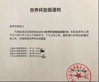 2018年6月13日世界杯比賽還未開始,車輪CEO吳峰通過個人朋友圈霸氣發起#世界杯放假挑戰接力#,放出了7月16日的放假公告,不得不說這個放假公告宣布的非常霸氣,著實是為互聯網圈所有的從業者謀取了一個大福利!