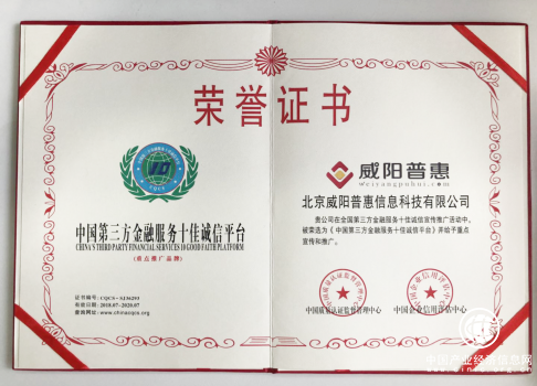 為進一步加快推進行業內的誠信金融體系建設,營造優良誠信的互聯網金融經營環境,在中國質量認證監督管理中心、中國企業信用評估中心在的宣傳推廣活動中,威陽普惠榮獲“中國第三方金融服務十佳誠信平臺”。