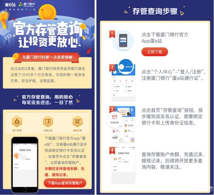 2018年7月,廈門銀行上線的存管查詢功能,給投資人吃下一顆“定心丸”。用戶可便捷查詢存管銀行的資金流水記錄,真正實現了銀行可以對用戶的資金進行管理和監督。同時也有助于緩解投資人的緊張心理,信任網貸平臺信息中介的身份。