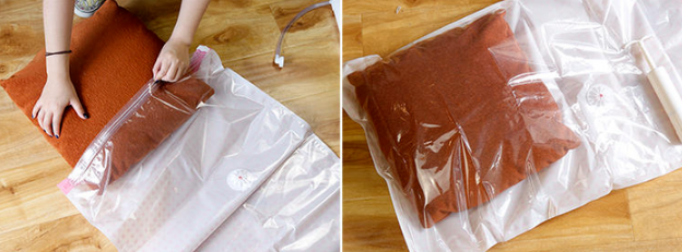 Step 2:放置衣物。挑選了一個厚度約為5cm的抱枕將它放在了小號收納袋中。