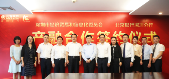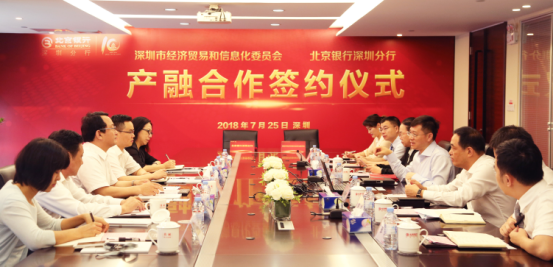 為貫徹落實《國務院關于深化制造業與互聯網融合發展的指導意見》(國發〔2016〕28號)和《中國制造2025》(國發〔2015〕28號),按照《深圳市人民政府辦公廳關于印發深圳市推進國家產融合作試點城市建設工作方案的通知》(深府辦函〔2018〕24號)的要求,強化金融對產業的支撐作用,2018年7月25日,深圳市經濟貿易和信息化委員會與北京銀行深圳分行舉辦“產融合作”簽約儀式。市經貿信息委副主任高林、預算監督處處長劉云紅、深圳市中小企業服務署副署長馮德崇、北京銀行深圳分行行長區瑞光、副行長張國都等出席儀式。