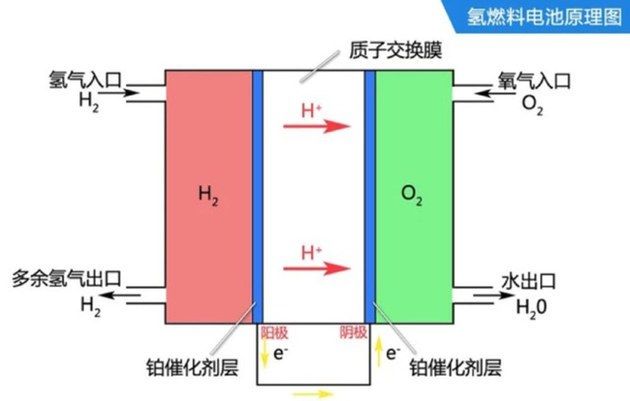 所謂氫燃料電池并不是真的燃燒氫氣,而是電池的一種,只不過原理和我們常說的鋰電池等有本質區別——氫質子穿透質子交換膜與氧分子結合,在催化劑的作用下發生氧化還原反應,而被阻隔在膜外的電子需要繞到電極板兩端,這一過程就產生了電流,同時反應產物只有水。