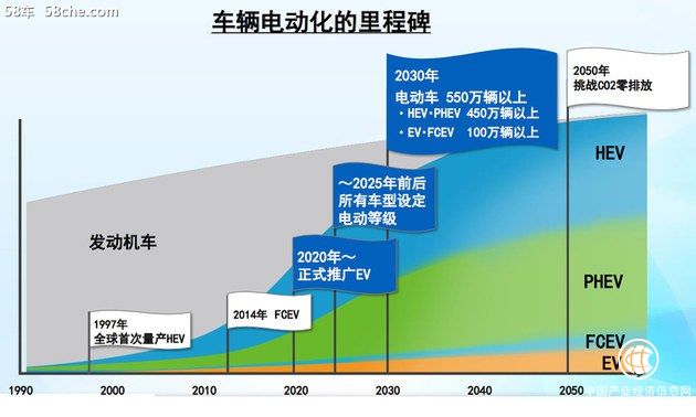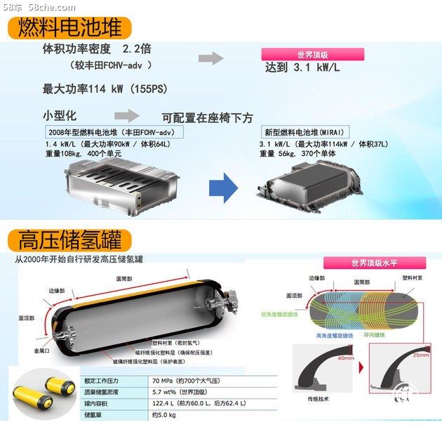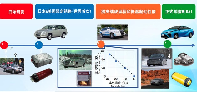 豐田對于氫燃料電池車的探索從90年代就開始了,到2002年豐田就已經開始在日本、美國限量發售氫燃料電池車“豐田FCH”;2008年針對特定用戶銷售的“Toyota FCHV-adv”,把一次加氫后的最大行駛里程從以往的330km提高到了830km,并且能在零下30度的低溫地帶啟動行駛;第一款量產的氫燃料電池車是“MIRAI”,2014年12月15日在日本正式發售。隨后,氫燃料電池巴士也在今年投入市場。