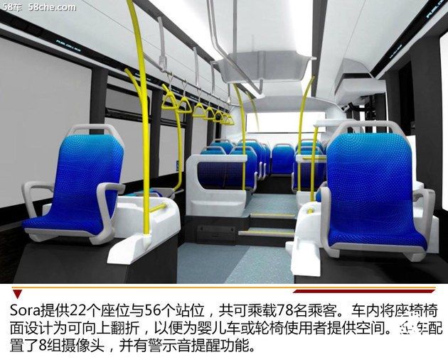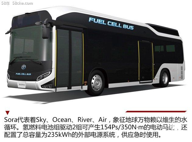 Sora擁有極簡且頗富科技感的外觀設計,配置LED頭尾燈組,車頭的Fuel Cell Bus顯示其為燃料電池車的環保身份。Sora還搭載了加速控制系統,在車輛行駛中的超速或突然加速等不當操作系統會主動介入;此外,到站控制系統還可幫助駕駛精確地指引巴士停到正確位置。