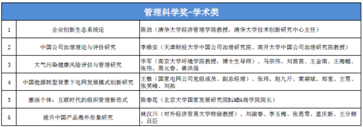 本屆管理科學獎,通過激烈的提名和競爭,共計評選出管理科學獎15項,其中學術類 6項,實踐類9項;管理科學獎專項獎30項;管理科學獎入圍獎29項。