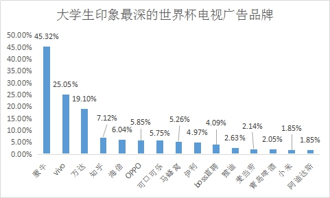 在提到世界杯期間印象最深的電視廣告品牌時,45.32%的受訪者表示對蒙牛投放的世界杯廣告印象最深,其次是vivo,約占25.05%。在受訪者廣告印象最深的前14個品牌名單中,包括蒙牛、vivo、萬達、海信、可口可樂、雅迪、麥當勞和阿迪達斯等7家FIFA官方贊助商,以及知乎、OPPO、馬蜂窩、伊利、boss直聘、青島啤酒、小米等7家中央電視臺賽事轉播合作伙伴和贊助商。