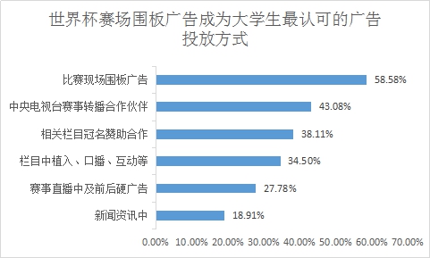 中國品牌在2018世界杯期間的廣告投放與營銷形式多種多樣,其中大學生最認可的廣告投放方式為在比賽現場投放圍板廣告,約占58.58%,其次43.08%的受訪者認同品牌通過成為中央電視臺賽事轉播合作伙伴的方式投放廣告,受訪者最不認可的廣告投放方式為在新聞資訊中投放廣告,約占18.91%。