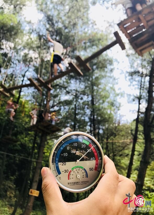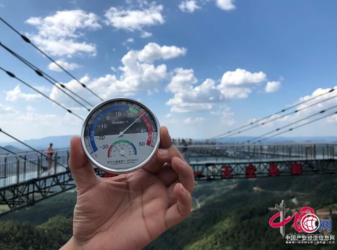 作為奧陶紀這一網紅景區的入口處,集結了天空懸廊、18米懸崖秋千、步步驚心等爆款網紅項目。這一區域由于極少有綠蔭遮蔽,本以為溫度會較高。但是,當下午兩點鐘,記者來到景區標志性項目天空懸廊時,拿出溫度計,指針定格在了29攝氏度。