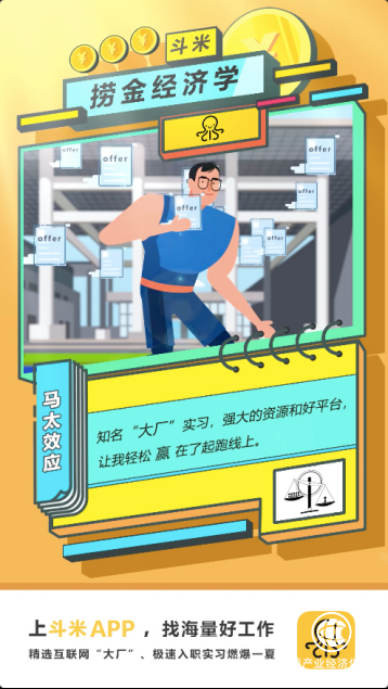 當其他同學還在為去大公司還是小企業糾結不已時,他則果斷通過斗米的撈金季活動選擇了去某知名互聯網“大廠”實習的機會。他說,這就是馬太效應的一種現實應用。在大的互聯網平臺實習,等于把大公司的品牌價值加于身,未來求職路上會更具分量籌碼,走的更穩。此外,他還看重互聯網扁平開放的公司文化——尊重個人的才華和能力,因為95后的他,特別渴望自我價值被認可。