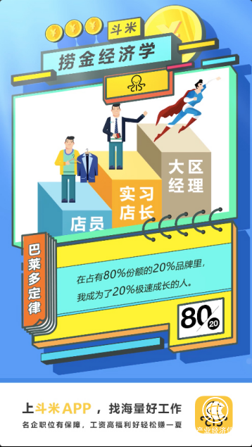 經濟學認為,20%的強勢品牌,占有80%的市場份額。陸濤用實際行動證明深諳二八定律,就能職場開掛,三年升三級,從普通導購到經理,成為了那20%的佼佼者。而他也是通過之前參加的斗米撈金季提供的名企全職崗位,成功入職了一家知名快時尚服飾店。
