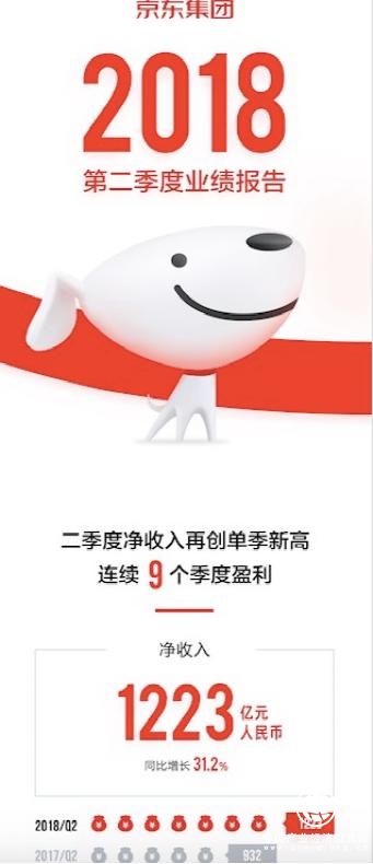 8月16日,京東集團公布2018財年二季度業績報告,報告顯示京東集團本季度凈收入一經達到1223億元人民幣,同比增長31.2%,不僅創下單季凈收入新高,還實現連續9個季度盈利。