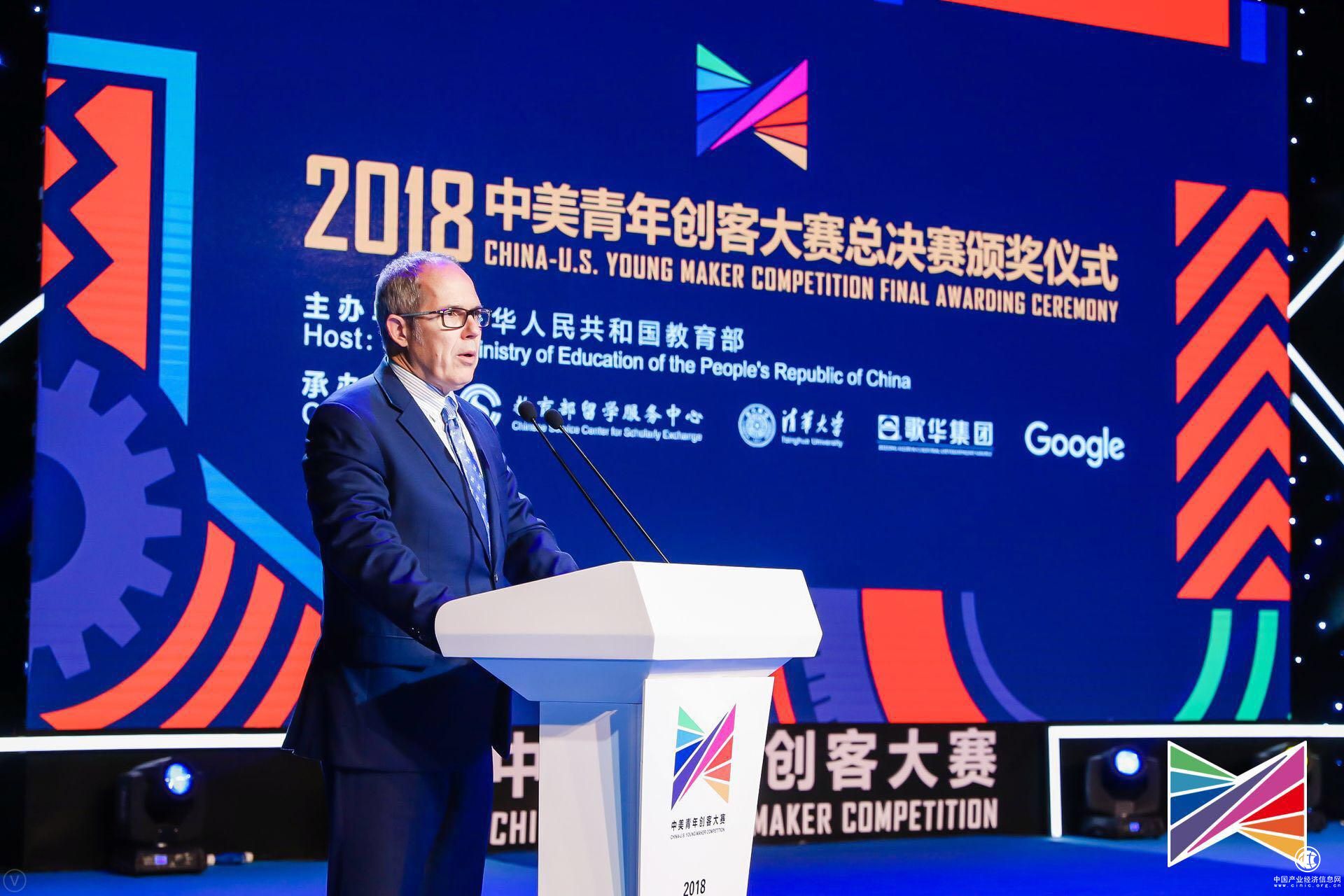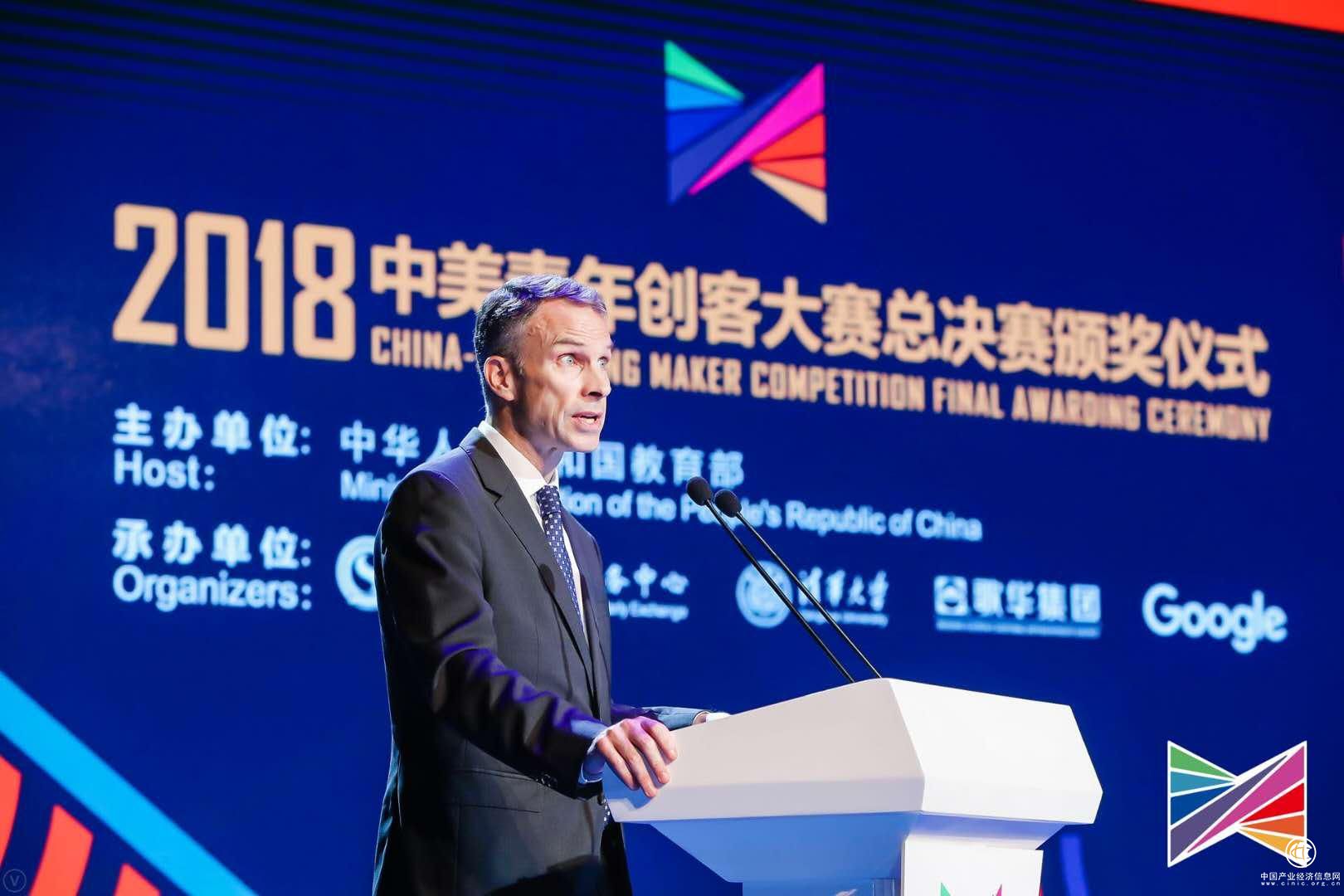 美國駐華大使館公使銜新聞文化參贊白詩浪(Frank Whitaker)在致辭中表示:美國政府與中國教育部在很多項目上進行了長期的合作,感謝教育部和承辦單位對大賽所做的努力。青年是社會發展的動力,為我們打造更美好的未來。美國總統富蘭克林是美國歷史上偉大的外交官,也是一位創客先驅。中美兩國可以通過合作來實現發展,我也相信美國和中國有更好的未來。