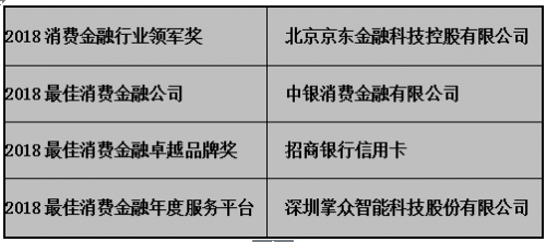 在中國消費金融行業飛速發展的趨勢背景下,為了規范和促進我國消費金融行業快速健康發展,充分調動中國消費金融行業機構發展業務的積極性,本屆年會進行了2018第二屆中國消費者最信賴的金融服務商“金消獎”頒獎儀式。現將獲獎名單公布如下: