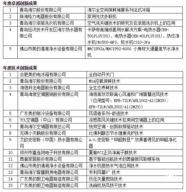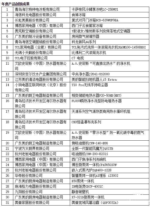 “中國家用電器創新成果推介”活動持續火爆,今年也同樣吸引了大量企業參與,(以下按照字母順序排列)安吉爾、奧克斯、奧馬、奧普、A.O.史密斯、巴慕達、比佛利、博世、長虹、戴森、大松、方太、格力、海爾、華帝、海信、九陽、卡薩帝、科龍、老板、美的、美菱、歐意、容聲、TCL、統帥、小狗、西門子家電、夏普、小天鵝等家電品牌成為中國家電行業的創新標桿。