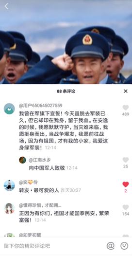 網友的認可度更是與日俱增。在軍事話題“我為軍改點贊”當中,一則軍人宣誓的短視頻讓無數網友眼睛濕潤。抖音網友“用戶650645027559”說出了大家的心聲:“在安逸的時候,我愿默默守護,當災難來臨,我愿挺身而出,當戰爭爆發,我愿前往戰場。因為有祖國,才有我的小家,我愛這身綠軍裝!”