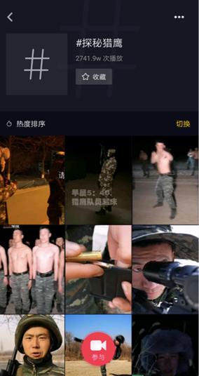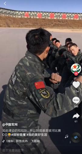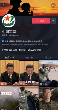 這種熱度持續很久了。2018年10月,中國人民解放軍新聞傳播中心網絡部的官方抖音賬號“中國軍網”入駐抖音,不到7個小時粉絲突破百萬。目前,該賬號的抖音粉絲數已有267.2萬,獲贊1713.5萬,122篇作品總共播放了3.6億次。