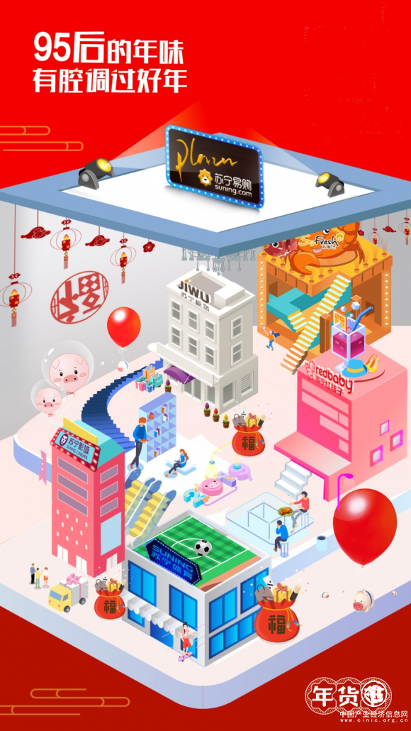 除了95后年味設計大賽外,各類特色年貨商品、新業態門店開業、蘇寧郵局的3公里免費配送服務在蘇寧易購生活廣場也是應有盡有。加上落地43城的福氣小鎮大型showcase,蘇寧將繼續從商品到服務到氛圍,打造全場景覆蓋的年貨節盛典。