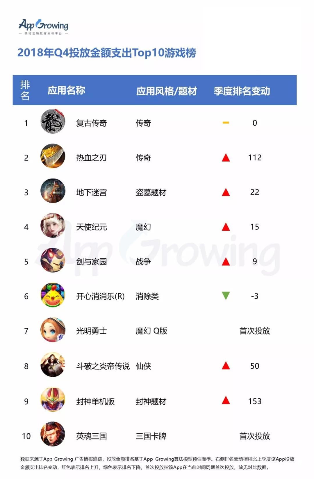傳奇類手游 《復古傳奇》《熱血之刃》分列 2018年 Q4 投放金額支出Top10游戲榜第一及第二,其中《復古傳奇》 已連續兩個季度位列投放金額支出榜首。在Top10 排行榜中,《光明勇士》《英魂三國》在 Q4 期間為首次投放。