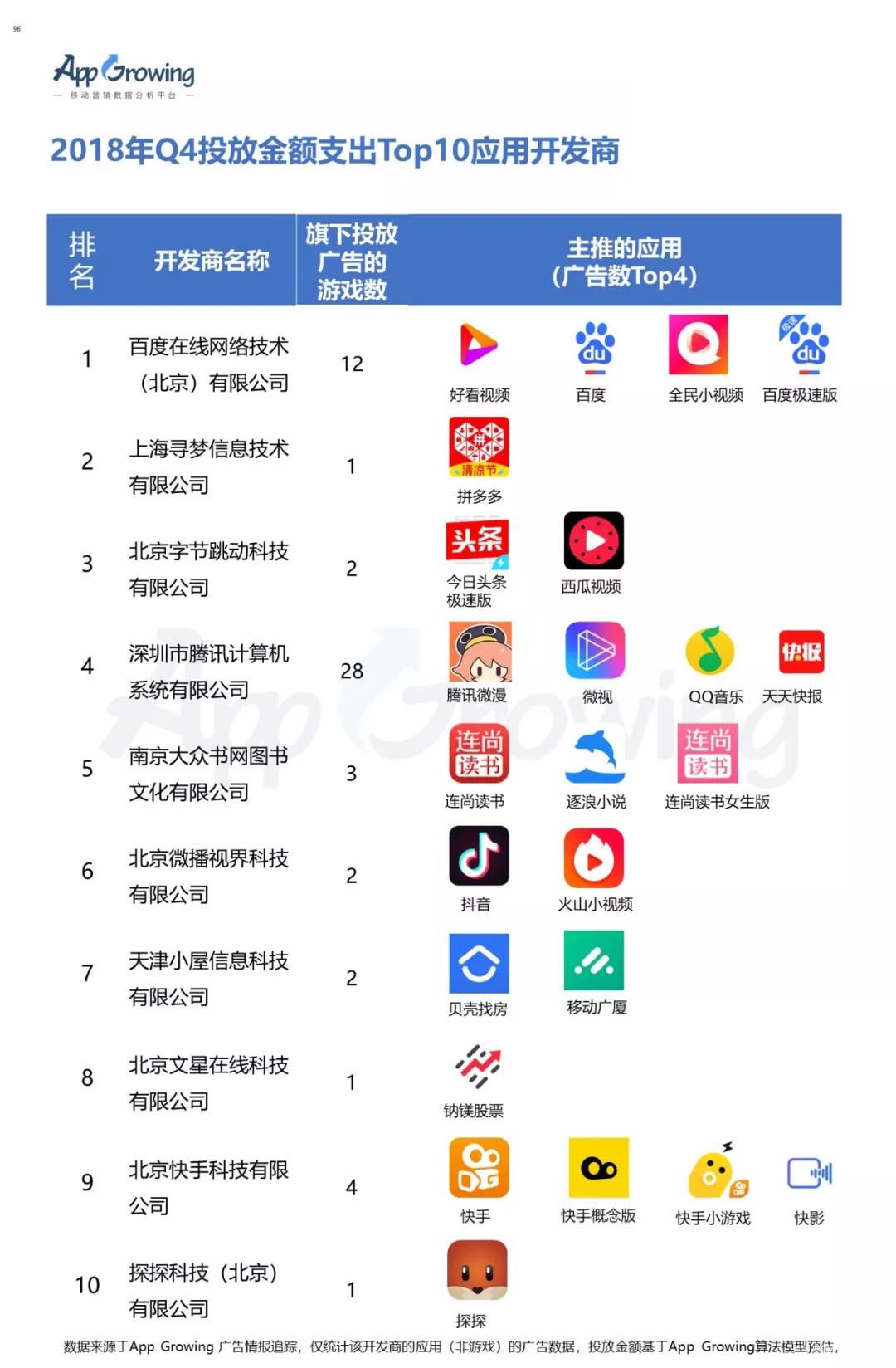2)2018年Q4 投放金額支出Top10應用開發商