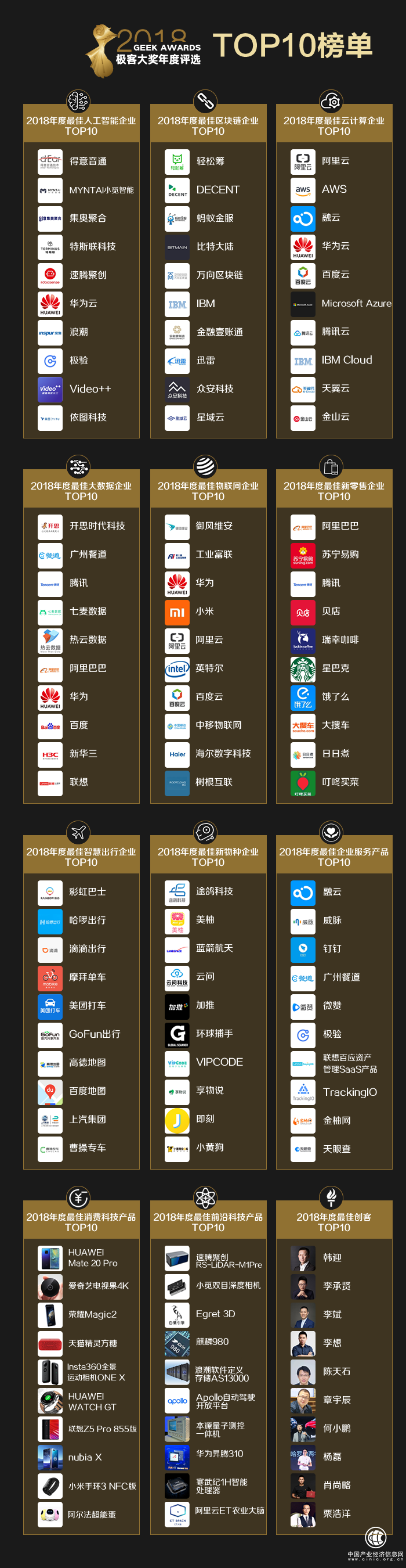 1月14日,2018極客大獎(Geek Awards 2018)年度評選結果隆重揭曉。歷經兩個月的大眾投票和專家評選,來自人工智能、區塊鏈、云計算、大數據、物聯網、智慧出行、新零售、新物種、企業服務、消費科技、前沿科技、創業創投共12個類別的年度最佳企業/產品/人物TOP榜單重磅出爐,為2018年的中國科技商業版圖增添一份新畫像。