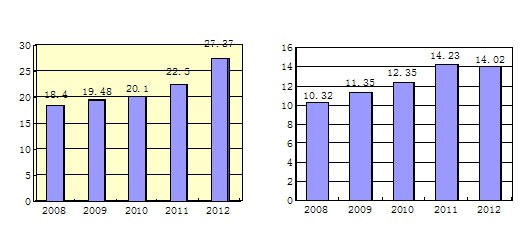 (2008-2012年福建報業總收入、廣告收入情況表)單位:億元