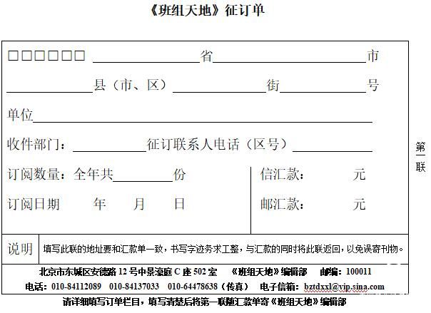 收款單位:北京中企互動文化傳媒有限公司 請在匯款單據附言欄中注明訂閱份數,同時通過傳真把單位、地址和聯系方式及匯款憑證傳真給《班組天地》編輯部。