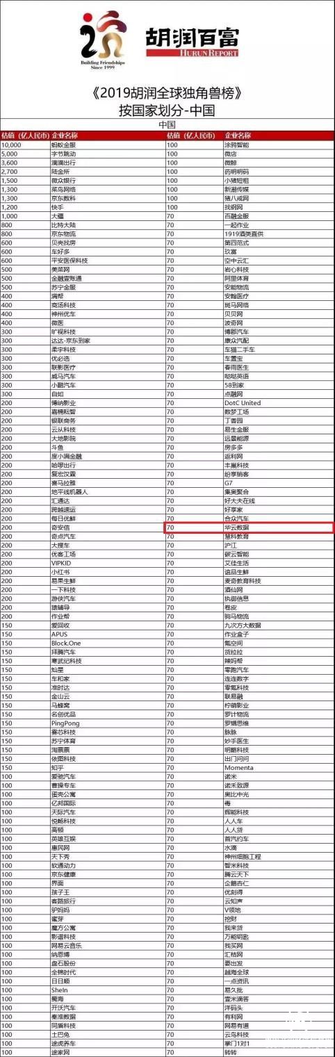 10月21日,財經研究機構胡潤研究院發布首份《2019胡潤全球獨角獸榜》,全球共有494家獨角獸企業上榜,其中,中國共有206家,數量排名全球第一。華云數據作為中國本土云計算服務商,憑借深厚的技術實力和強勁的發展態勢成功進入榜單,是榜單中為數不多的中國云計算企業之一。