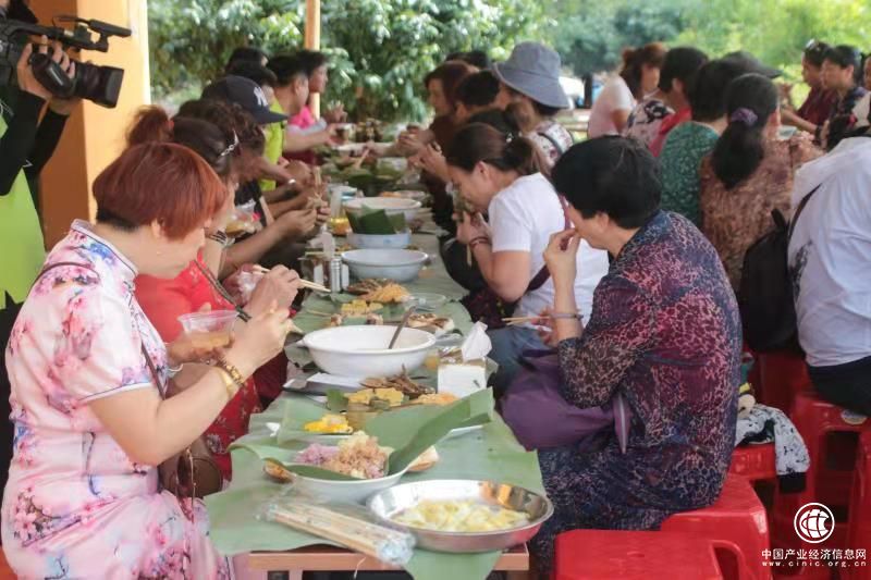 五里路茶韻共享農莊為游客們準備了特色的黎族長桌宴,黎族長桌宴是黎族宴席的最高形式和最隆重的禮儀。桌上鋪滿綠油油的芭蕉葉,上面盛著竹筒飯、小魚干、三色飯、農家豆腐、白切雞等當地特色美食。菜過五味,游客們換上了黎族服裝,參加了摘山蘭稻稻穗的比賽,充分體驗了黎族同胞的生產和生活,享受豐收的喜悅。