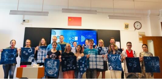 王曉老師引導德國師生進行了一場以《遇見嶗山的美好》為主題的扎染體驗活動。在實際操作的過程中,德國師生在王曉老師的指導下,充分發揮自己的想象力和創造力,不僅在花紋和捆扎手法方面有諸多嘗試,在花紋數量上也大膽進行了突破。