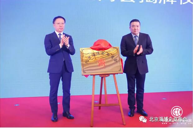 淄博市委書記江敦濤(左)和北京淄博企業商會會長欒貽明共同為商會揭牌