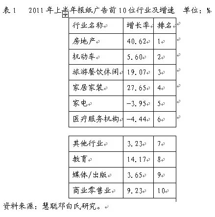 2011年上半年,報紙廣告的快速增長主要得益于房地產廣告的快速增長和二三線城市的快速發力。其原因如下:第一,當房地產容易銷售和極其不容易銷售的情況,房地產廣告都很難發展,當房地產既不容易銷售但又有一定的銷售量時,房地產廣告就會快速增長;第二,隨著二三線城市的傳媒市場的成熟,具有區域化優勢的報紙廣告房地產、家居家裝等增長明顯。報紙廣告的前10位行業及其增長率具體見表1。