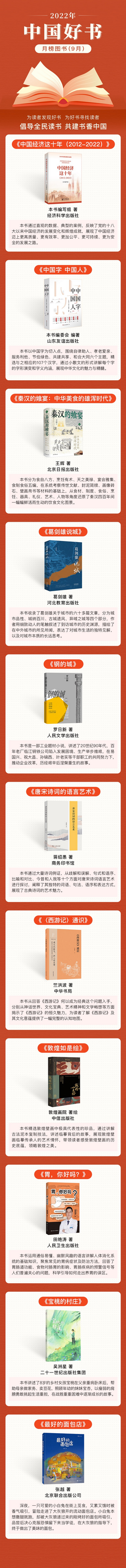 在中宣部出版局指導下,經中國圖書評論學會組織評選,2022年9月“中國好書”榜單發布:《中國經濟這十年(2012-2022)》《中國字 中國人》《秦漢的饗宴:中華美食的雄渾時代》《葛劍雄說城》《鋼的城》《唐宋詩詞的語言藝術》《〈西游記〉通識》《敦煌如是繪》《胃,你好嗎?》《寶桃的村莊》《最好的面包店》入選。
