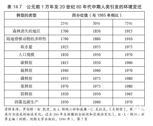 20世紀90年代初在人類對環境影響的大規模統計中,羅伯特·W. 凱茨、特納二世以及威廉·C.克拉克做了一個有意思的嘗試,衡量在若干不同范圍里的人類對環境的影響。他們選取10種基本的衡量人類對環境影響的指標,測算公元前1萬年到1985年之間的整體性影響,然后試圖確定每一種變化在什么時候分別達到25%、50%以及最后75%;這些數字都羅列在表14.7里。最快捷的理解此表意義的辦法就是要觀察每一種影響在什么時候達到其在1985年水平的50%。對于7個變量而言,在1945—1985年的40年間發生的變化比之前10000年更多。至于剩下的三個變量——森林消失、脊椎動物滅絕以及大氣層碳排放——所有變化的50%都發生在20世紀中葉以后。從編年史角度看,20世紀僅為歷史的一個小片段,但是其所見證的轉型的規模卻超過了過去全部的人類歷史。
