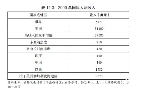 雖然我們衡量這些不平等的嘗試是粗略的、近似的,但是仍然清楚表明某些趨勢。全球人均收入表明,該指標從1900年的1500美元增加到1998年的6600美元。在此同一階段里,全球預期壽命——生活幸福的最重要指標,從大約35歲增加到大約66歲。這些都是意義重大的成就,但是正如表14.3和表14.4所示,它們的分布卻是不均衡的。美國2000年國民人均收入大約為34 100美元(而最高收入國家平均27 680美元),但是巴西的國民人均收入大約為3580美元,而中國(200年前的經濟超級大國)僅為840美元,印度(另一個前經濟巨人)和布基納法索則分別為450美元和210美元。而比率則使這些差異變得更加驚人。這些數字表明布基納法索的國民人均收入不到最高收入國家平均值的1%,而印度和整個撒哈拉以南非洲僅及平均值的1.5%。當然預期壽命統計的比率不那么極端,現代醫療知識提高了全世界的預期壽命。盡管如此,統計數字清楚表明相對貧困縮短了壽命。