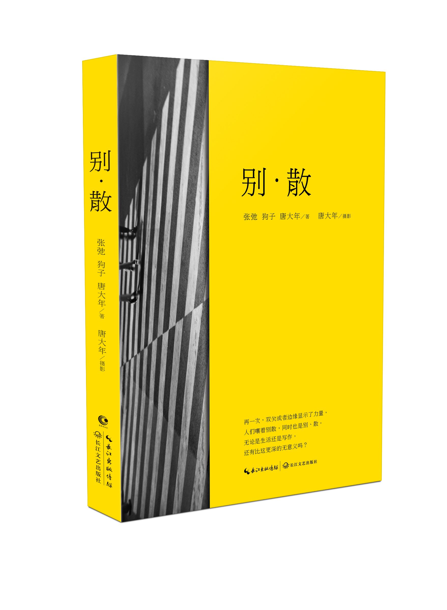 《別·散》作者之一狗子在書中回憶稱:這本書的由頭是唐大年拍攝的張弛和狗子的合影而起。“后來當我在老弛手機上看到這張照片時,第一感就是它非常適合作為一本小說集的封面,否則真覺得可惜了,它差不多就是我對所謂頹廢主義的想象。再后來我把這個想法跟老弛大年說了,他也有此意,正好我們各自手里都有沒發表的作品,于是出一本合集的事就這么定了下來。”