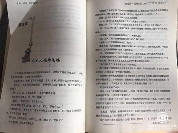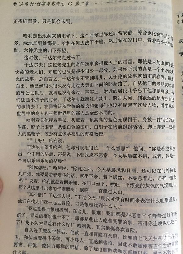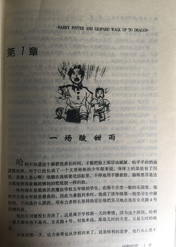 還需要吐槽一點的是,我們可能無法理解豹走龍這種生物,該書的頁眉上非常貼心的有英文版翻譯:Harry Potter And Leopard Walk Up To Dragon,不過,定睛一看,依然無法理解這種生物:Leopard Walk Up To Dragon,豹子走到龍?