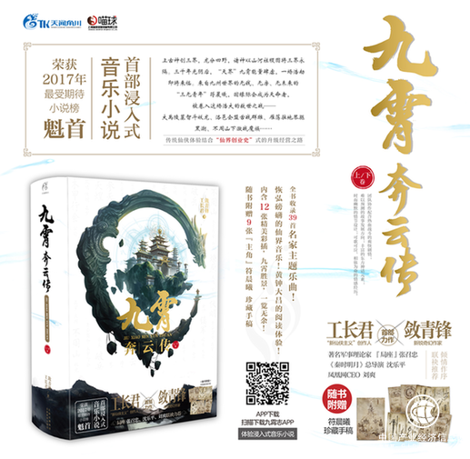 而這個新穎的概念隨著此次的新書入手得以揭曉,使用手機掃碼功能或九霄志APP掃描每章節首頁的二維碼,即可欣賞到為《九霄奔云傳》量身打造的39首純音樂曲目,皆出自與工長君合作過仙劍,古劍等知名游戲項目的駱集益老師和馮明梟老師之手,而音樂作為該小說的主打概念的核心,創造者有意將聽覺因素帶來的感染力與小說情節相結合,給讀者帶來多感官上的通感體驗。