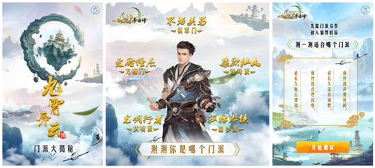 除了書迷們為《九霄奔云傳》自發的打Call助威外,官方的宣傳動作也較為活躍。除了頻繁的微博交流互動與福利活動以響應書迷熱情。在微信朋友圈也切合時宜的推出的一款《九霄門派大揭秘》的H5小游戲,更讓仍未了解《九霄奔云傳》普通讀者對小說豐富個性的門派種類和世界觀產生了興趣。